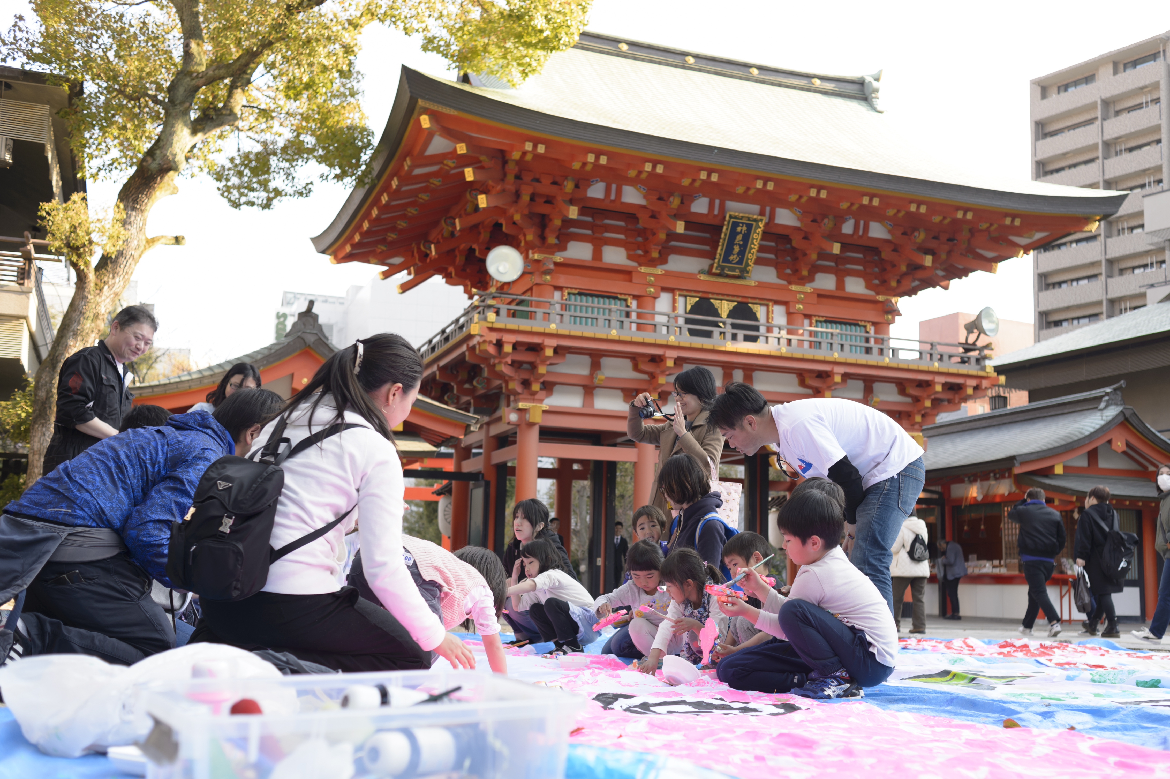 生田神社境内にて、大きなこいのぼりに、だるまの墨入れの様に子ども達に気持ちを込めて目入れとスタンプで色づけをしてもらうイベントです。