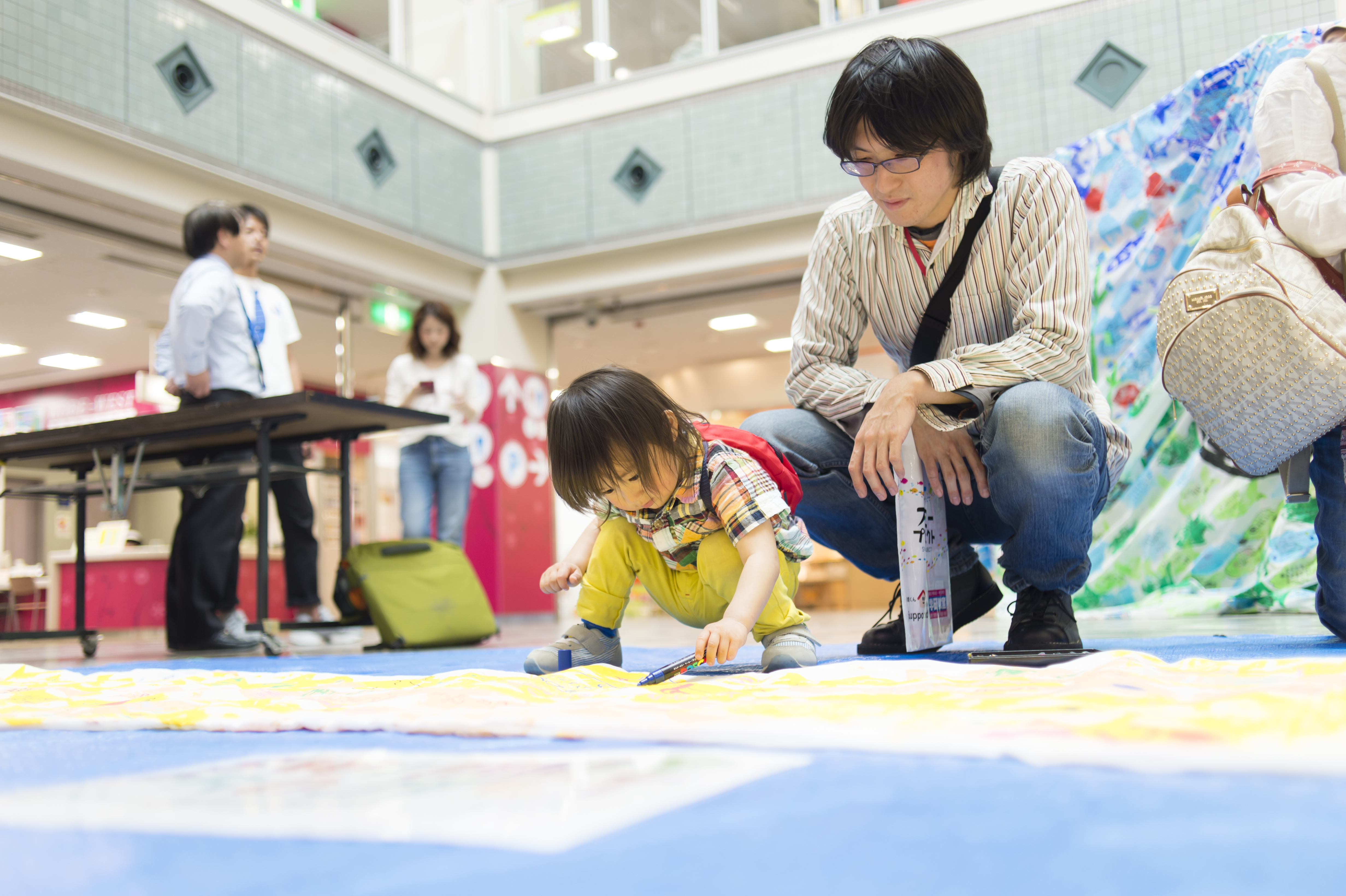 そのスタンプを「絵馬」に見立ててお子さんたちに夢を描いてもらい、大きなスイミーこいのぼりを協力して完成させるイベントです。