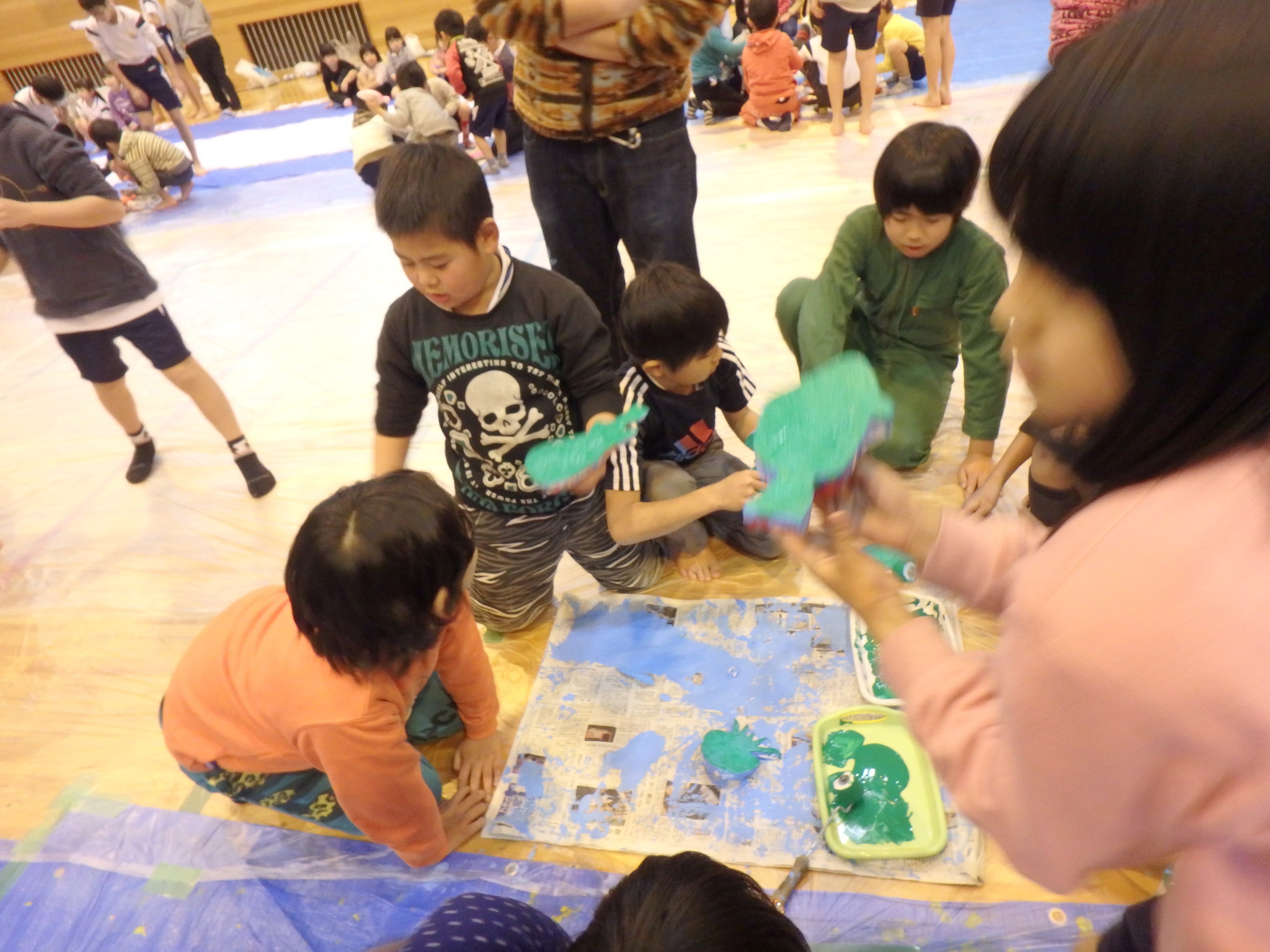 発砲スチロールをリサイクルして作った魚のスタンプを使い、大きな10m真っ白こいのぼりを「スイミーこいのぼり」にする為のスタンプ押しアート製作活動です。