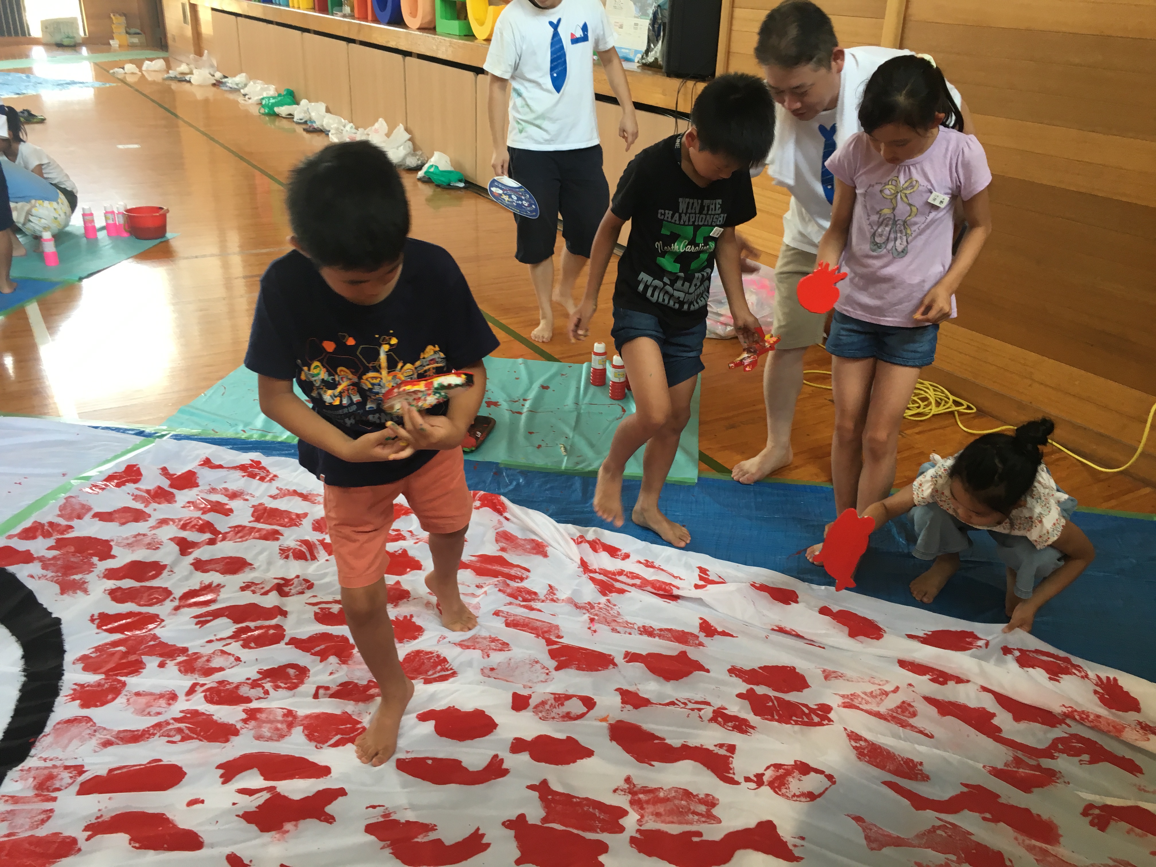 超巨大30mスイミーこいのぼりスタンプ押しアート@神戸市立西郷小学校