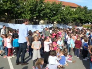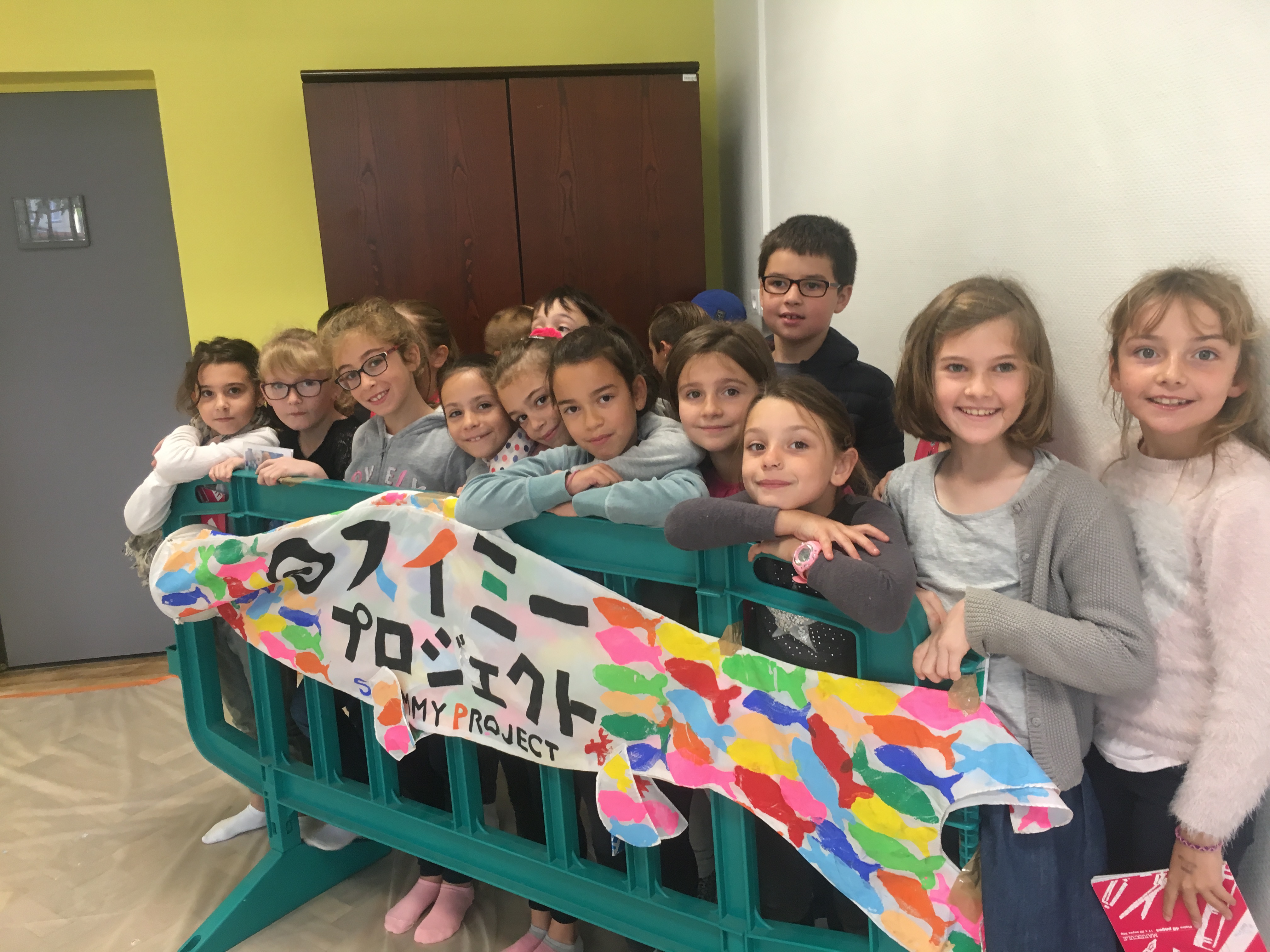 フランス・オーヴェルニュのモザックのEcole Primaire de Mozac, Ecole Élémentaire de Mozac.小学校、学童施設の子ども達による2018年用10mスイミーこいのぼりの制作イベントを2日間にわけて開催します。