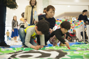 4月14日(土)15日(日)ライブペイント@神戸ハーバーランドumieでは、全国から有名クリエイター16名を招き、スイミーこいのぼりの中の小さな魚達を引っ張る大きな魚のライブペイントアートイベントと子ども達もアート制作に参加できるイベントを開催。