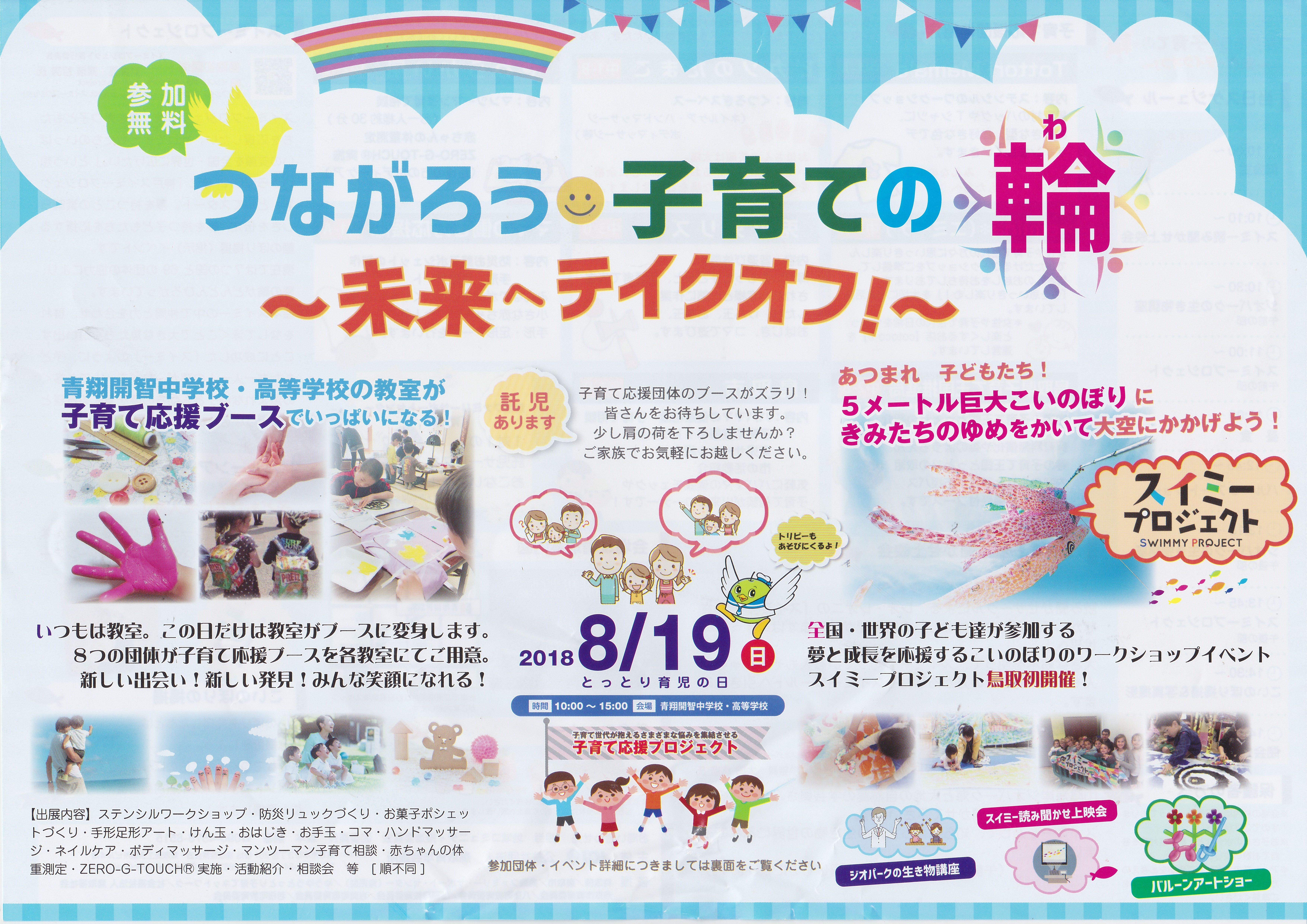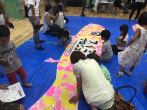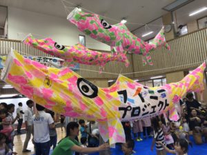 公益社団法人鳥取青年会議所主催「つながろう子育ての輪」が開催され、スイミープロジェクトも一事業として子ども達との5mこいのぼり制作・掲揚イベントを行いました。